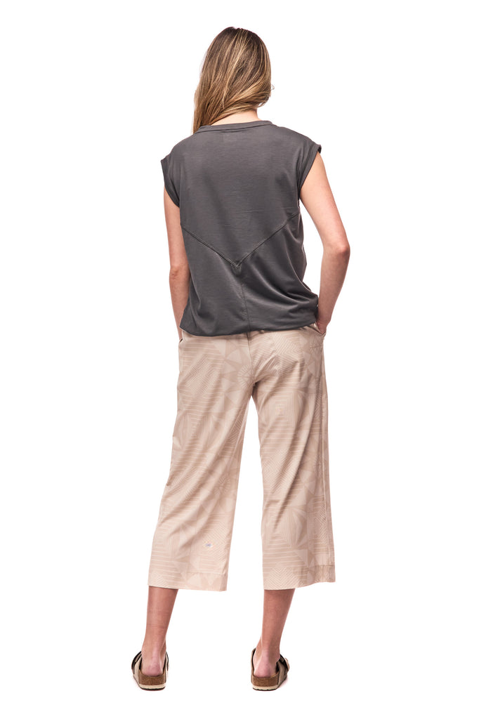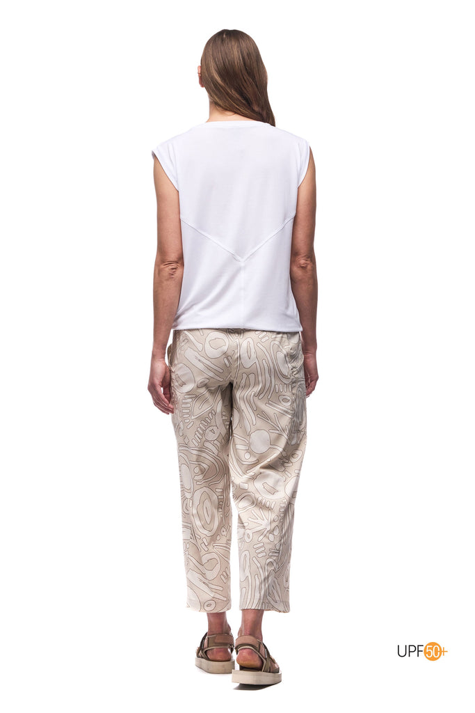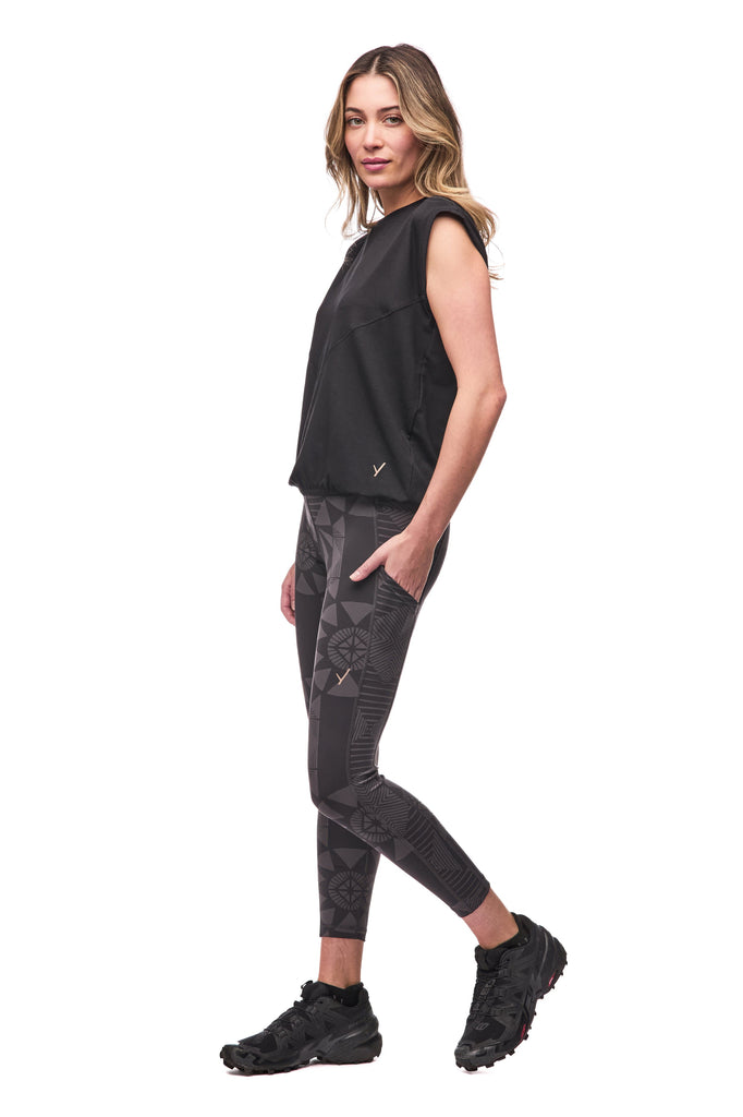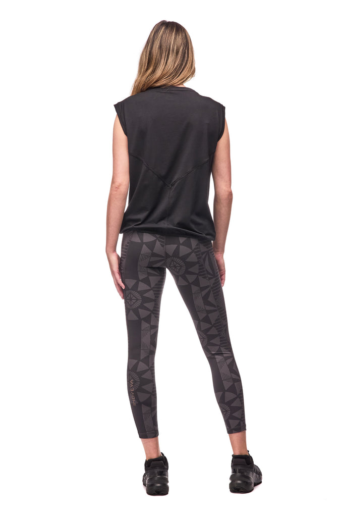 A sleeveless flowy t-shirt with a fixed elastic hem detail at the hip and criss-cross seams.