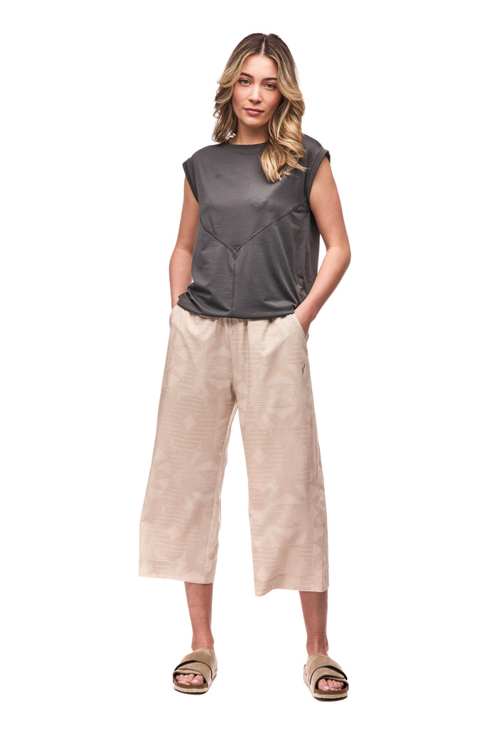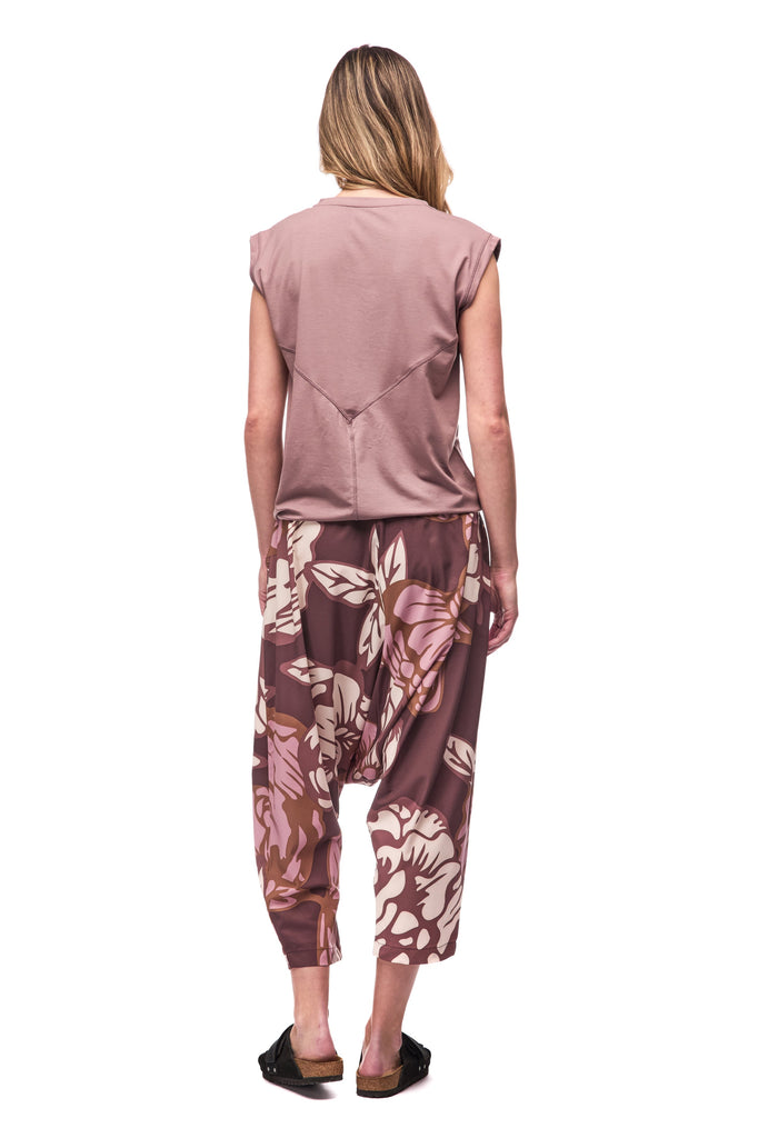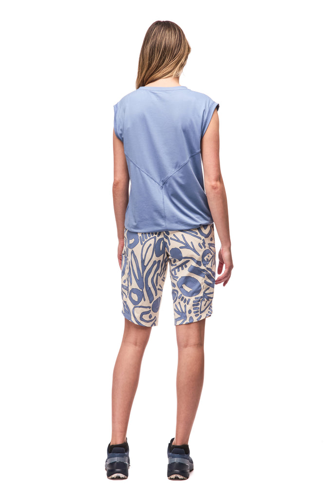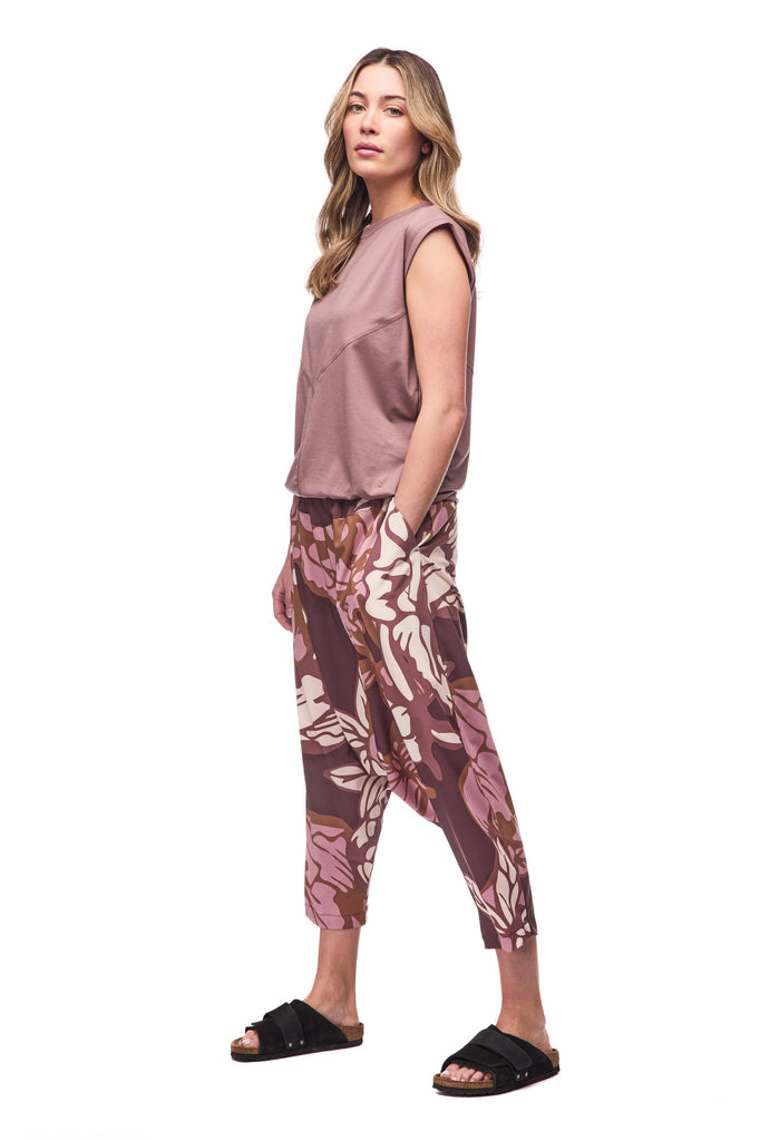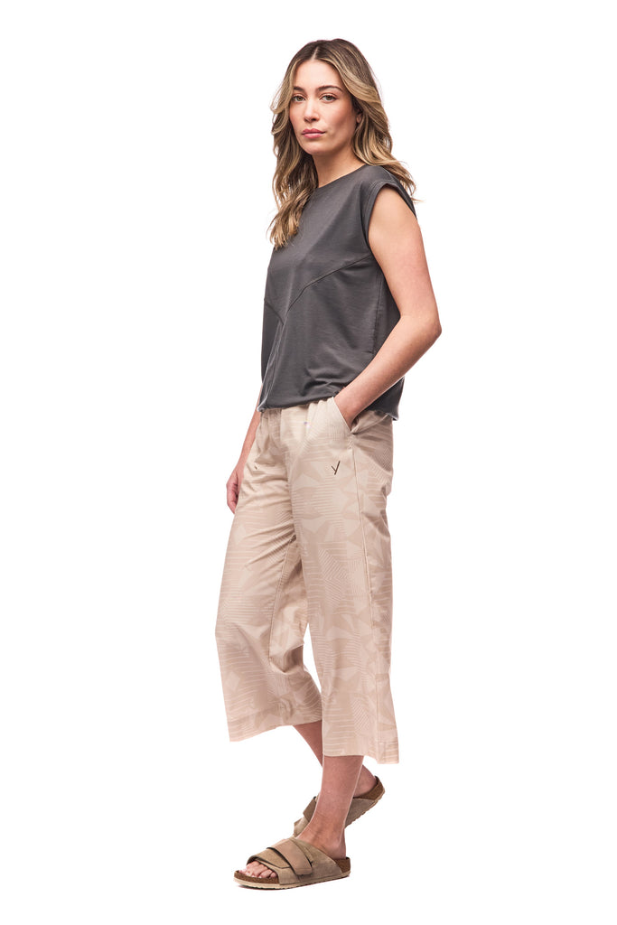 A sleeveless flowy t-shirt with a fixed elastic hem detail at the hip and criss-cross seams.