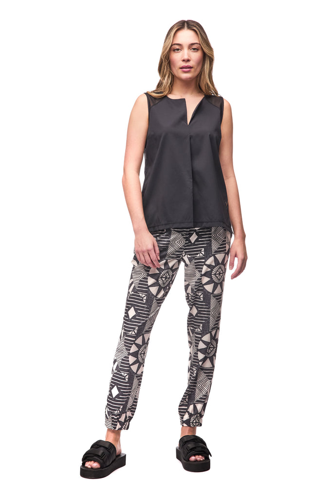 A sleeveless top with mesh inserts at the shoulder, front pleat and a v-notch collar.
