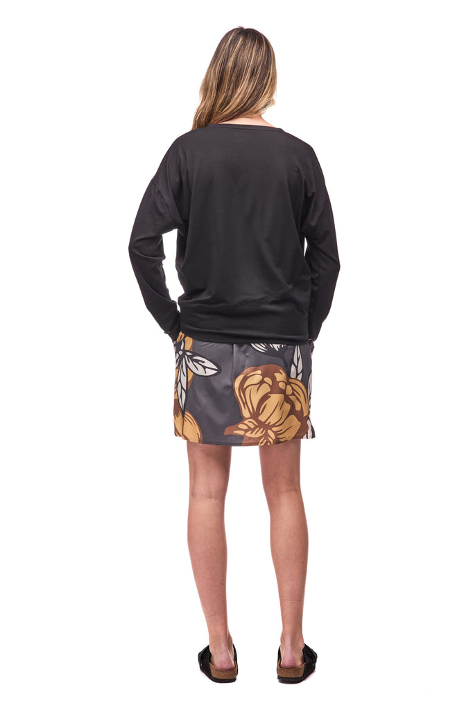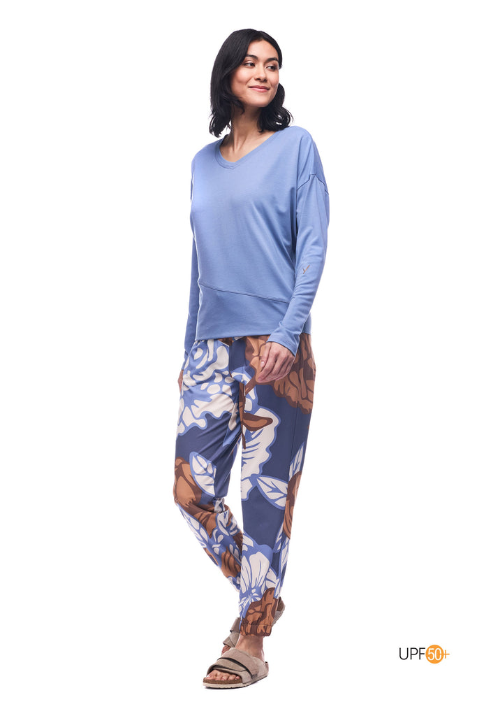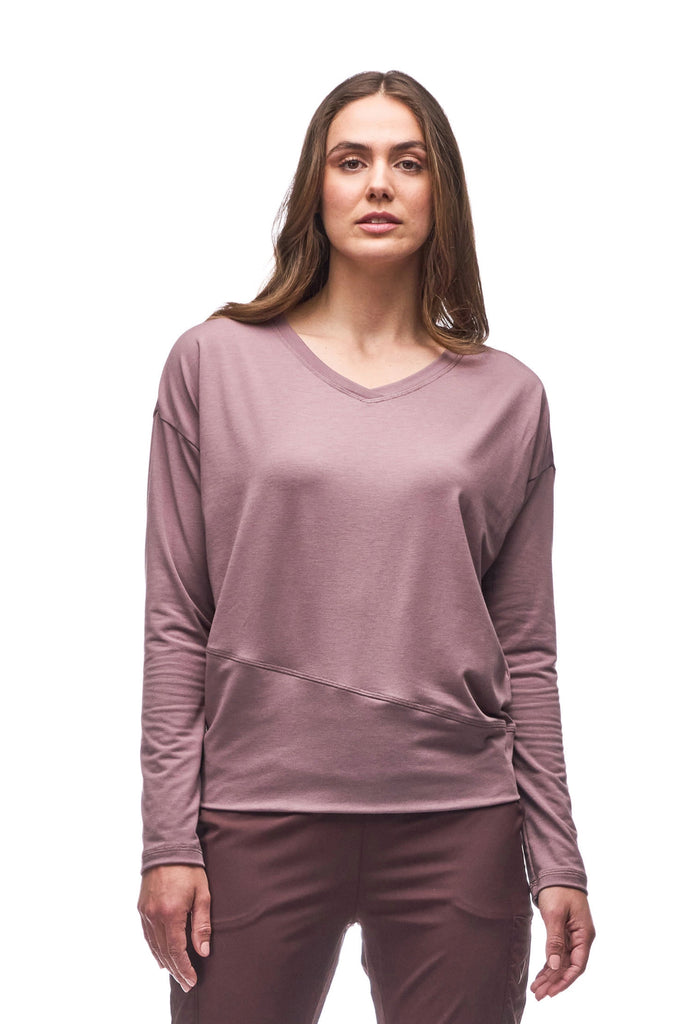 A long-sleeved v-neck top with dropped shoulders and asymmetrical crossbody seam.