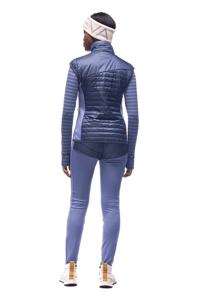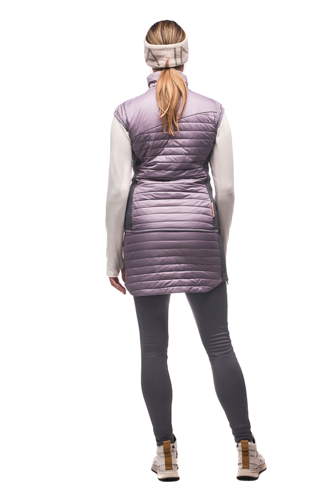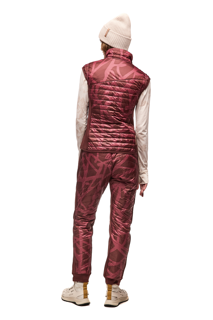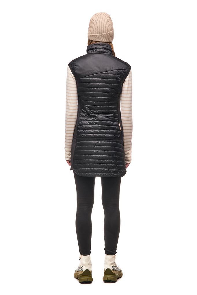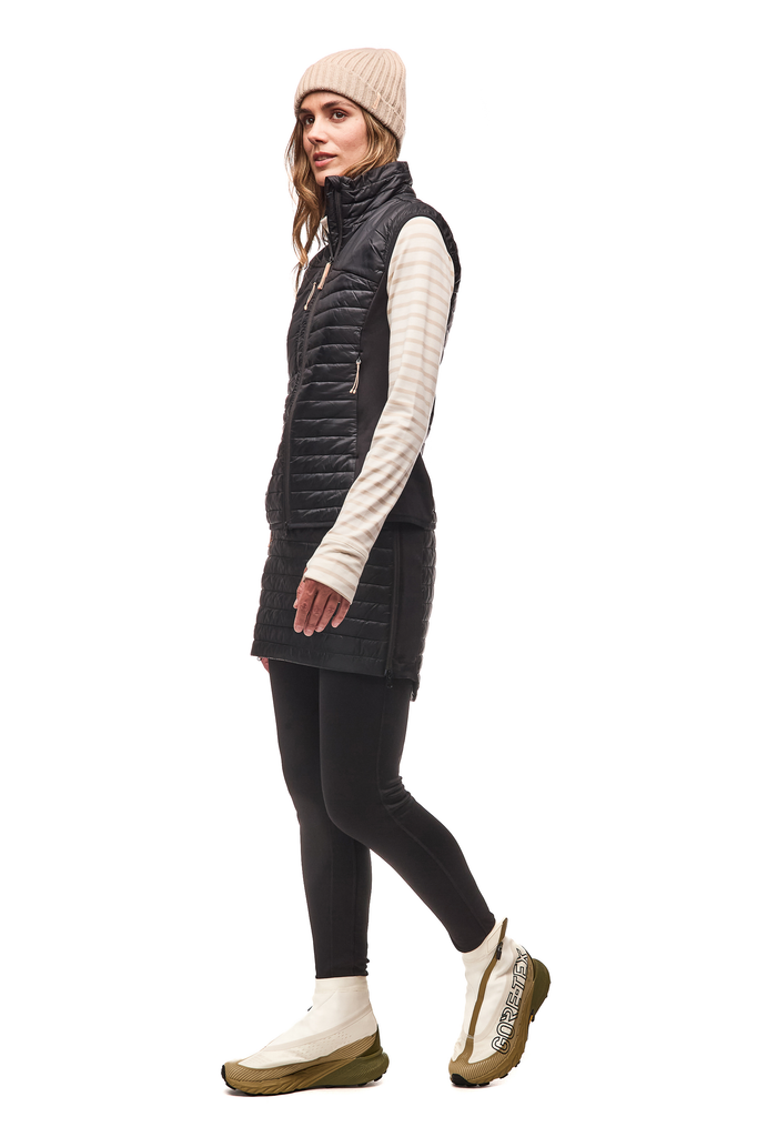 Quilted sleeveless vest with zipper closure and high collar. Multiple strategic pockets.